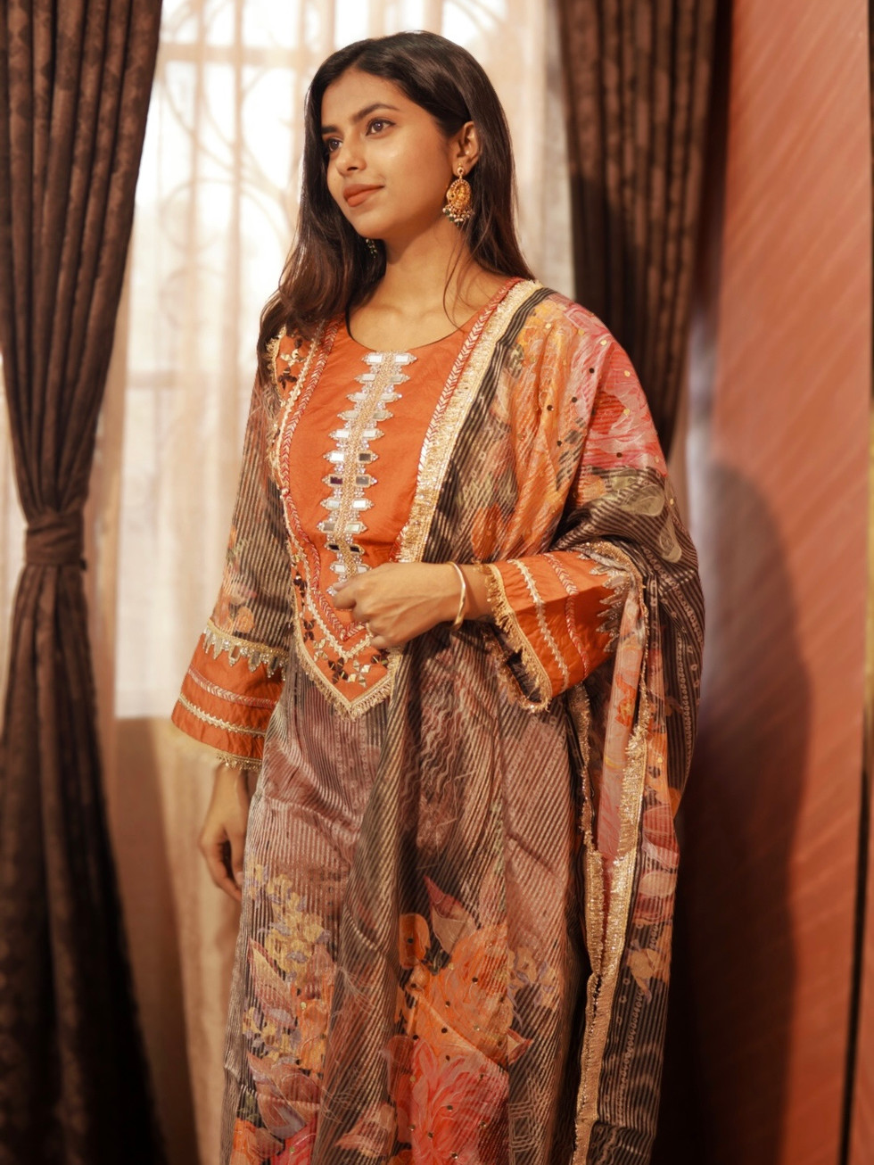 Step into radiance with our Shimmer Tissue Mirror Work Suit Set, a blend of festive elegance and artisanal craftsmanship. The lightweight shimmer tissue fabric adds a luminous sheen, while delicate mirror work on the neckline and sleeves elevates the look with a touch of sparkle. Beautiful lace detailing along the hemline and dupatta edges completes this timeless ensemble with refined grace.